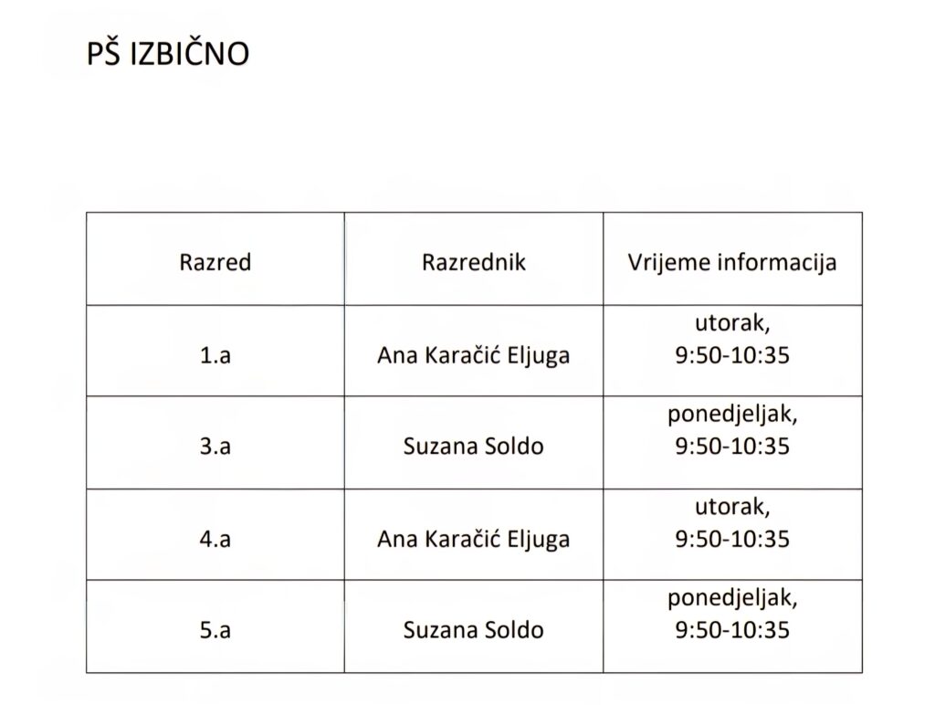 Raspored zvonjenja – područne škole